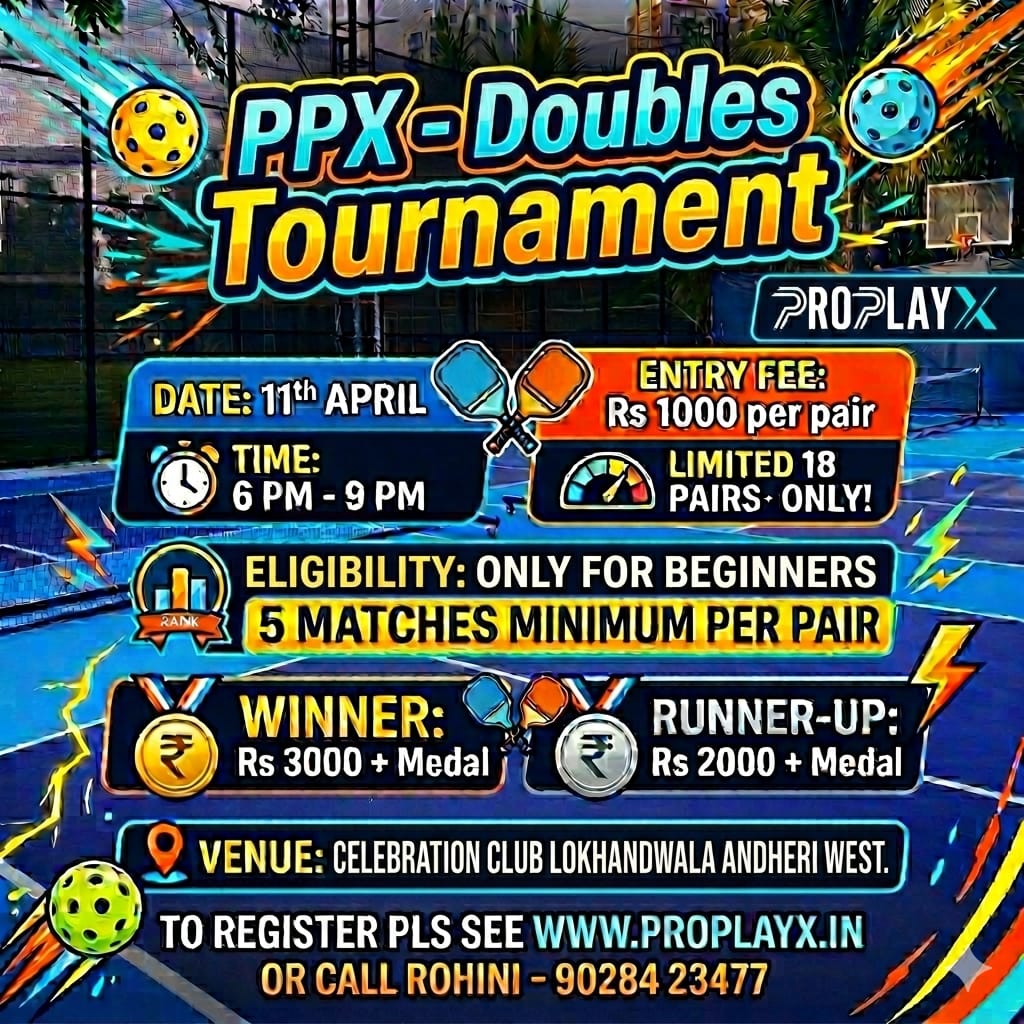 Experience the thrill of competitive Pickleball at one of Mumbai's premier sporting venues. With professional-grade turf and a vibrant atmosphere, it’s not just a tournament—it's a celebration of the fastest-growing sport in the world. Space is limited! Don't miss out on the chance to win big and join the ProplayX legacy.
